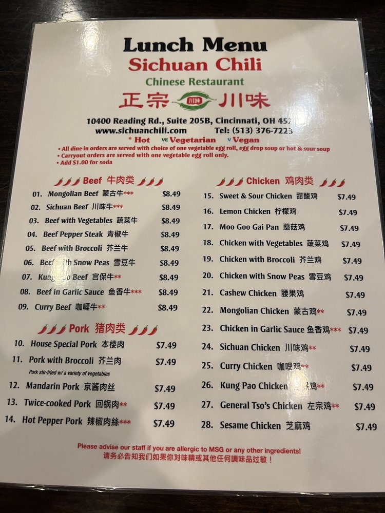 Welcome to Sichuan Chili Chinese Restaurant, a culinary gem nestled in Cincinnati's Evendale. This restaurant masterfully captures the bold and intricate flavors of Sichuan cuisine. The menu is rich with enticing options, featuring generous portions that cater to both spice enthusiasts and those seeking comforting classics.